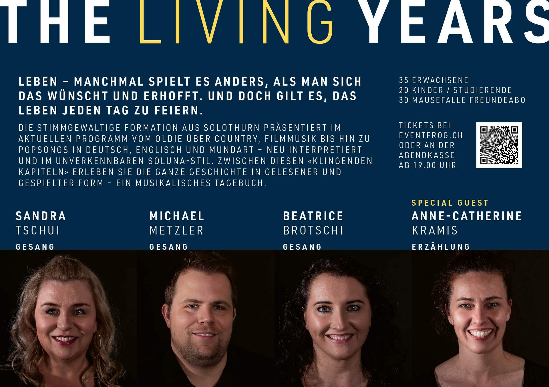 Die stimmgewaltige Formation aus Solothurn präsentiert im aktuellen Programm vom Oldie über Country, Filmmusik bis hin zu Popsongs in Deutsch, Englisch und Mundart - neu interpretiert und im unverkennbaren Soluna-Stil. Zwischen diesen "klingenden Kapiteln" erleben Sie die ganze Geschichte in gelesener und gespielter Form - ein musikalisches Tagebuch.